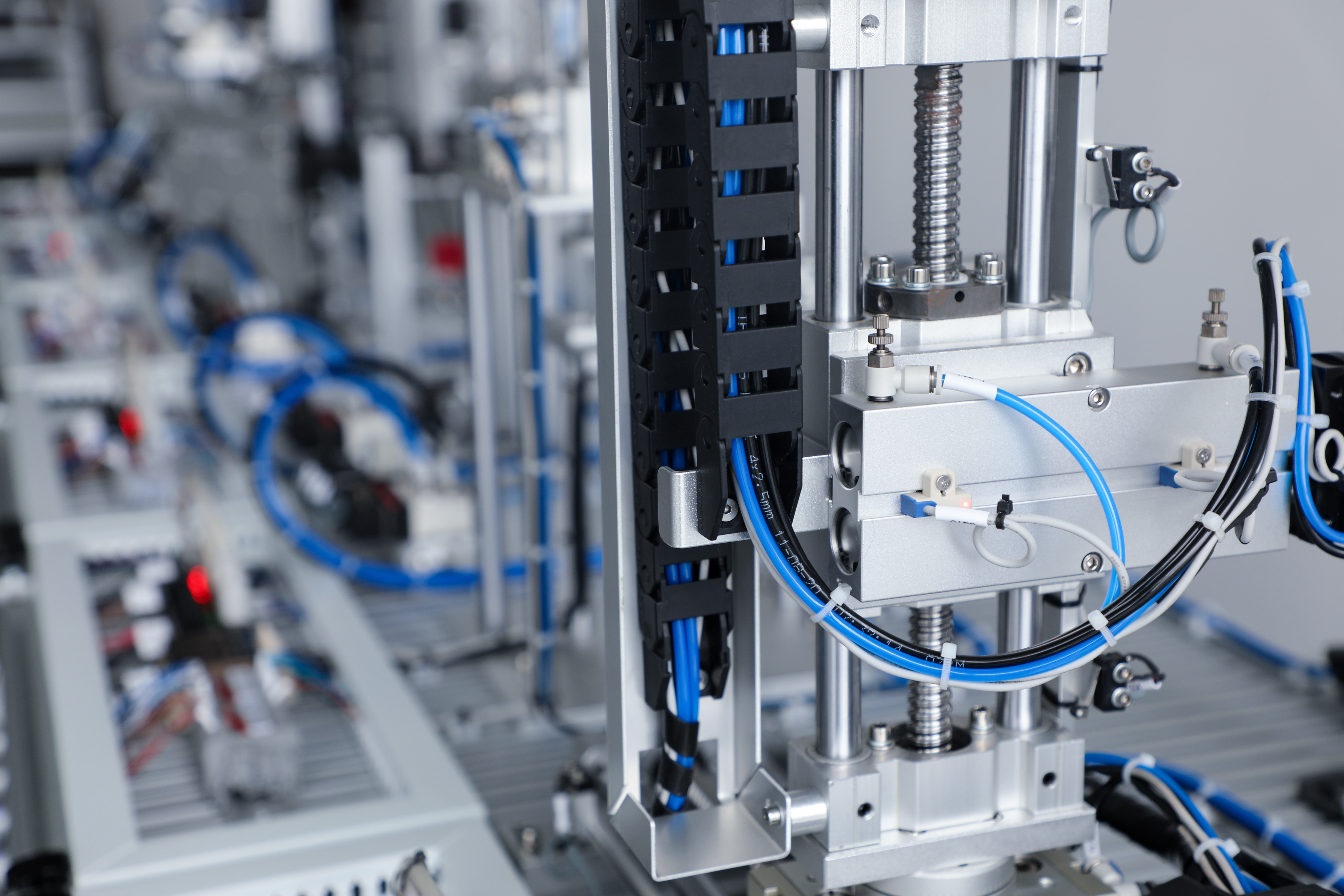 17轴四工位切片机设备主要是设备主要是对材料进行分切加工处理,以制成不同规格形式的片材,以用作后期加工 处理。其采用伺服送料的方式,控制片材长度;通过伺服机械手吸取物料,自动选择相应轨道,并将物料放入轨道之中; 通过侧推夹紧伺服固定片材移动间隙;正推伺服将片材送入切刀执行区进行规格宽度裁切。控制系统采用伟创自主研发 的VC5总线型高性能PLC,整机驱动采用EtherCAT总线SD710通用型伺服驱动,其具有:接线少、响应快、调速范围宽、 定位精度高、有足够的传动刚性和高速稳定性等特点。