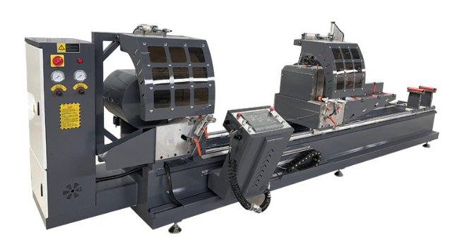 双头锯在门窗加工行业里应用较为广泛。可用于超宽工业铝材,太阳能铝 材,光伏铝材切割,亦可用于铝合金幕墙料、窗料、塑料型材切割下料。 该锯通过齿轮齿条传动,可完成型材不同规格的下料,锯片可根据需求完 成45°或90°的切割设定。