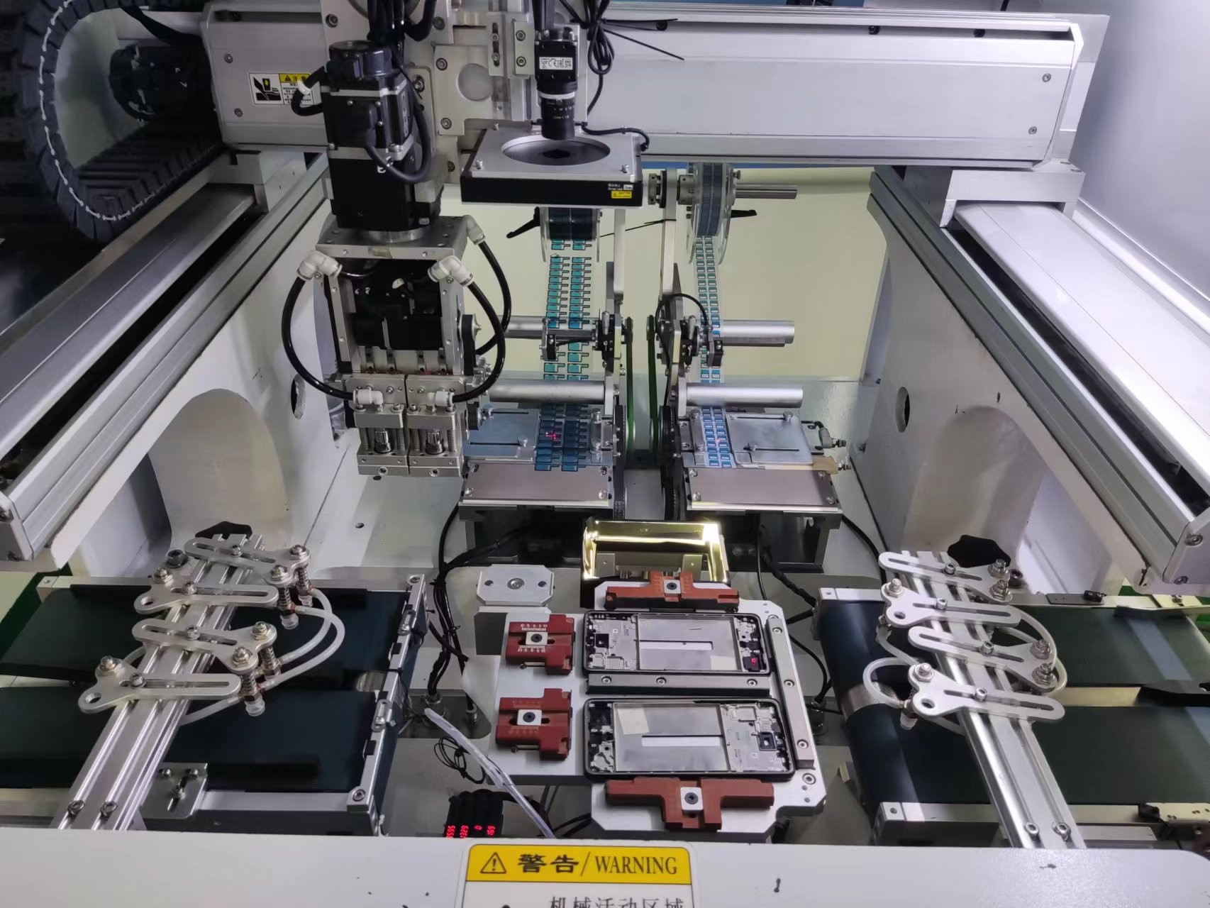 手机辅料贴合机主要是对手机壳内部在组装零件之前贴合的一直防震胶垫,常应用于摄像头与机壳的固定等,该设备主要是把来料(贴合物)通过视觉相关定位等逻辑处理后,由机械手取料然后精准贴合在手机壳内侧,贴合精度控制在0.07mm。该设备能够实现高效换型,自动抛料,多种取料与贴合模式切换,可以一次最多取4张物料,贴合2台手机壳内框。